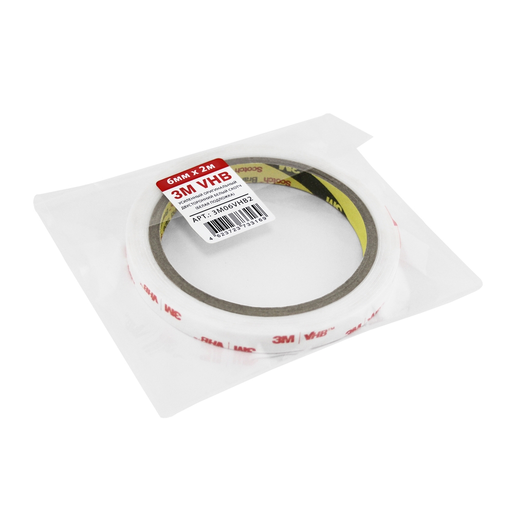 Усиленный двусторонний скотч 3M VHB — оригинальный, белый, с белой подложкой. Ширина 6/8/10 мм, длина 2 м. Используется для монтажа светотехники, молдингов, рамок, декоративных элементов. Обеспечивает прочное соединение без сверления. Устойчив к влаге, вибрациям, перепадам температуры. В наличии — обезжириватели, герметики, монтажные комплекты. Обращайтесь — подберём, проконсультируем в магазине RĀYOT.