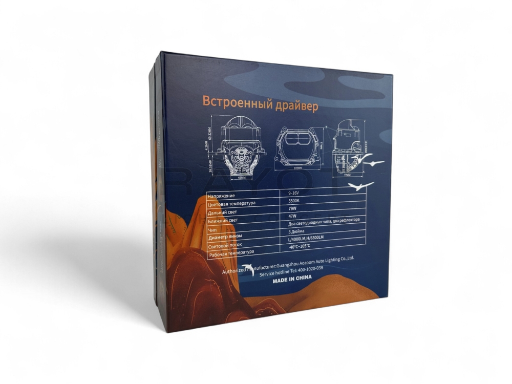 Линза Aozoom B-013 2024, 3.0", 12V, 47W/79W, 5500K, 4000/6300 лм — прямоугольный корпус, тройная оптика, двойное охлаждение, комплект 2 шт.