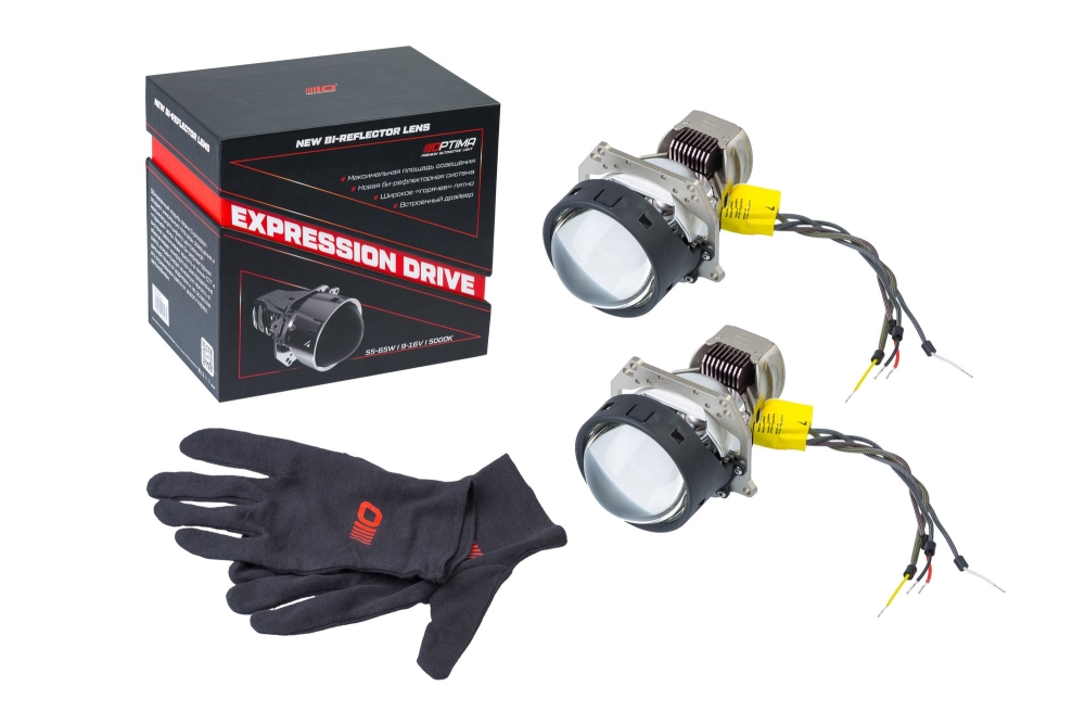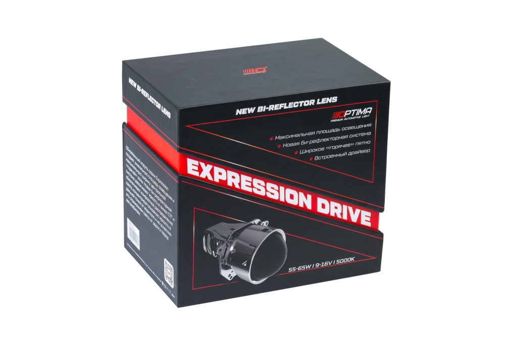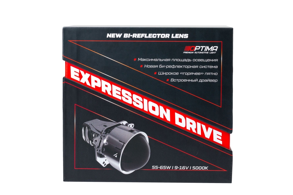 Optima Premium Bi-LED Lens Expression Drive 3.0" (5000K, 55/65W) — линзы премиум‑класса с диаметром 3,0", обеспечивающие мощный белый свет с температурой 5000K и световым потоком в диапазоне 4000–5200 Lm (в зависимости от режима мощности). Работают при напряжении 12V, потребляют 55/65W, обеспечивая высокую яркость и стабильность. Поставляются в комплекте из двух штук.