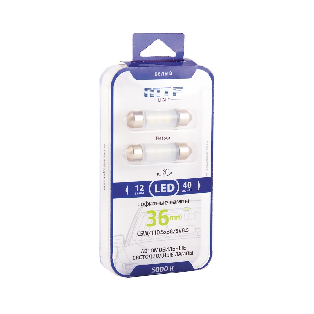 MTF Light софитная LED 10.5×36 мм (5000K) — это компактные светодиодные лампы для подсветки салона, багажника и номерного знака. При мощности всего 0.5 Вт они обеспечивают нейтральный белый свет 5000K, создающий современное и комфортное освещение. Лампы отличаются низким энергопотреблением, долговечностью и производятся в Тайване. Поставляются в комплекте из двух штук.