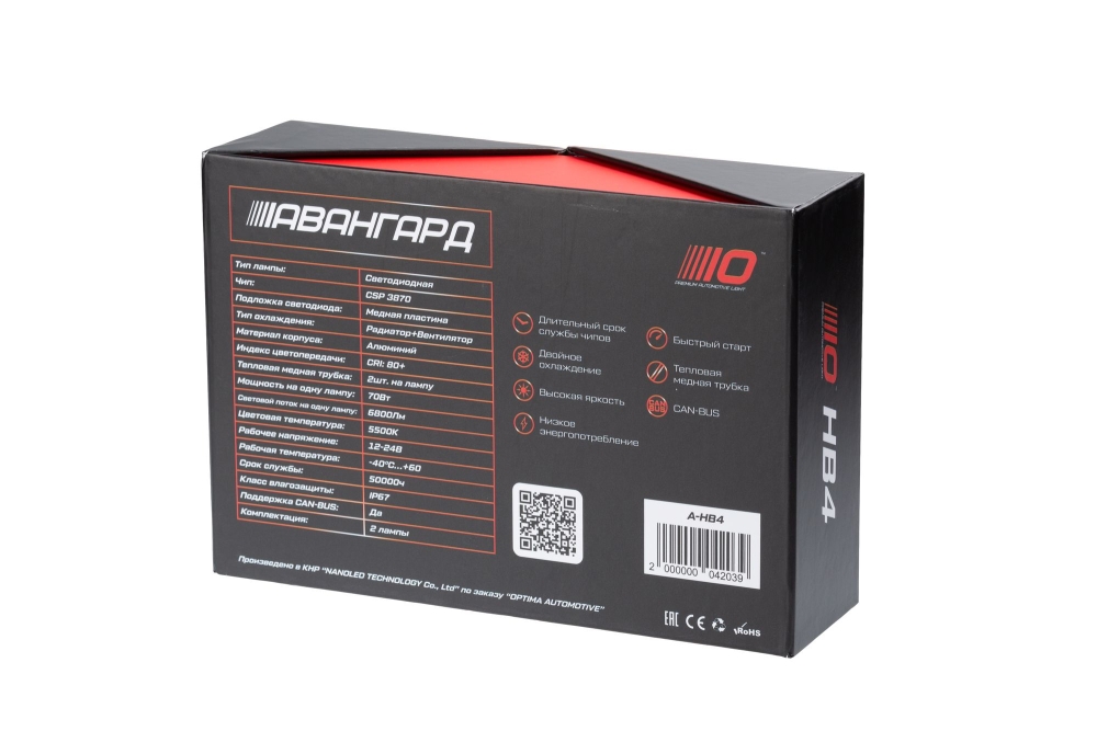 Optima Premium LED АВАНГАРД HB4 (5500K) — это светодиодные лампы из серии Premium LED АВАНГАРД, разработанные для замены штатных галогенных источников света HB4. Они обеспечивают яркий белый свет с температурой 5500K, световой поток 6800 Lm и стабильную работу в диапазоне 12–24V при мощности 70W. Лампы создают премиальное освещение дороги и подчёркивают современный стиль автомобиля. Поставляются в комплекте из двух штук.