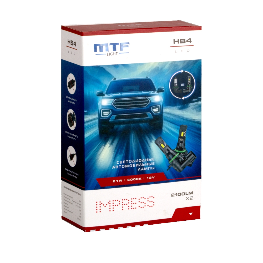 Светодиодные лампы MTF Light IMPRESS, HB4 (9006), 6000K, 2100 лм, 21 Вт, штатный размер, комплект 2 шт.
