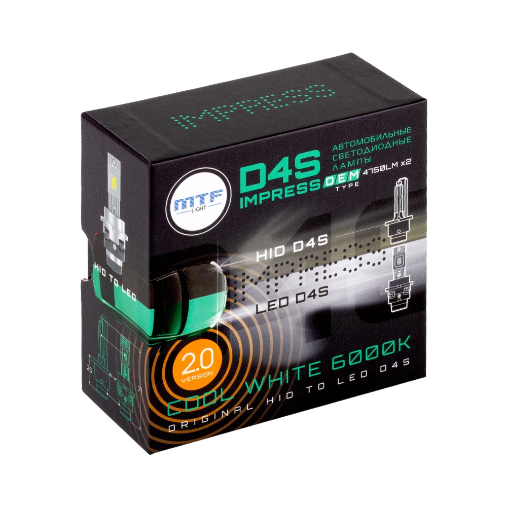 Светодиодные лампы MTF Light серии IMPRESS OEM — 35W, 4750 lm, 6000K. Цоколи D2S и D4S — подходят для замены штатного ксенона без переделки. Штатный размер, совместимость с заводскими блоками розжига. Белый свет 6000K — визуально ближе к ксенону, с лёгким холодным оттенком. Установка без вмешательства в конструкцию фары. В наличии — переходники, герметики, монтажные комплекты. Обращайтесь — подберём, проконсультируем в магазине RĀYOT.